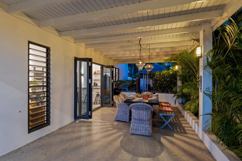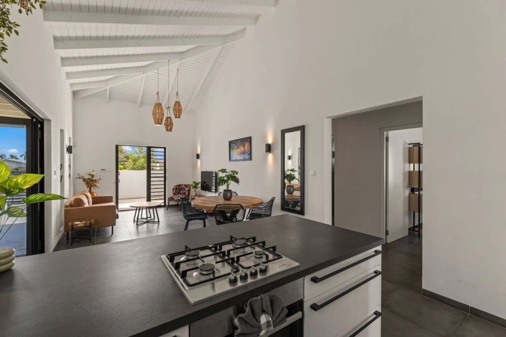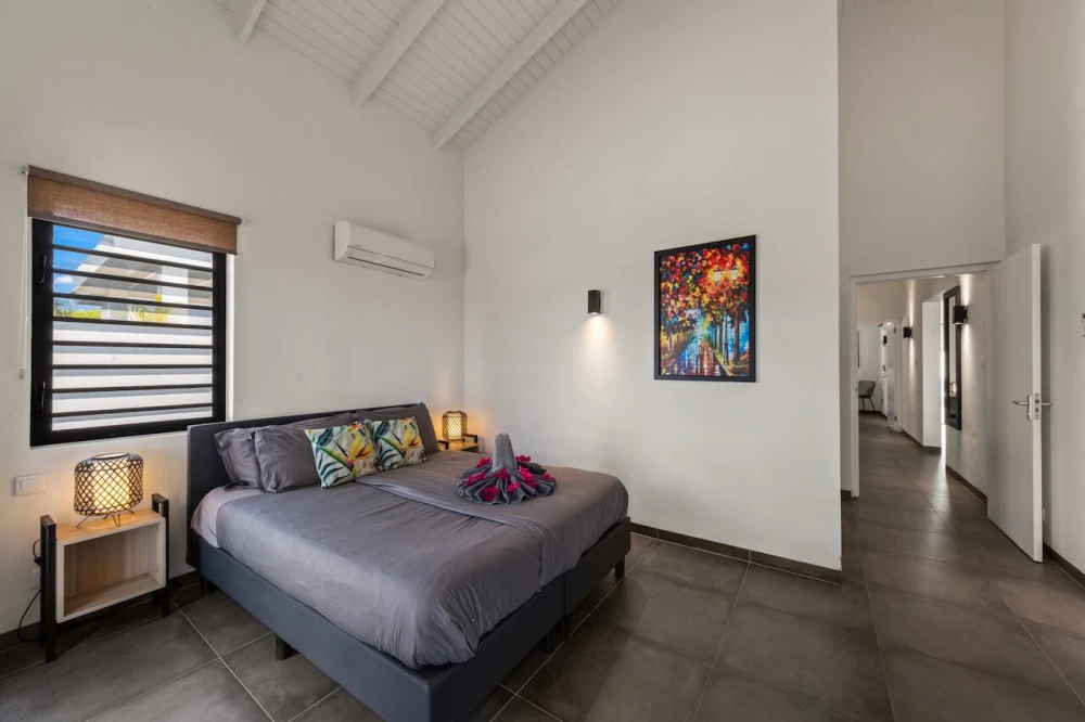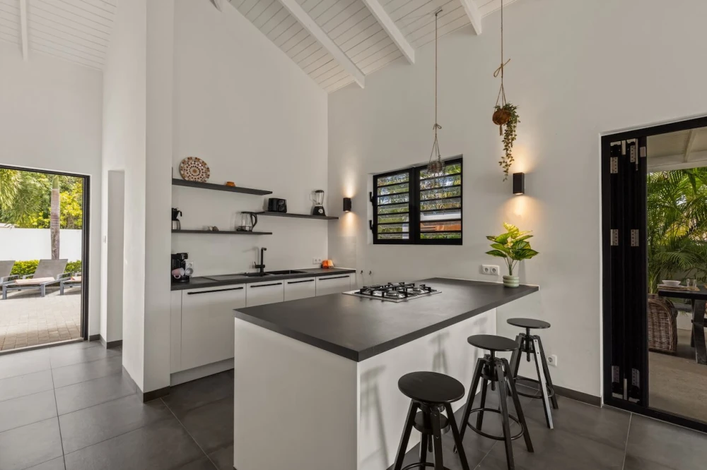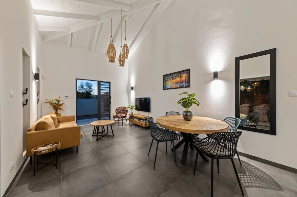villa beschikt over een hoog houten plafond dat een typisch Caribische