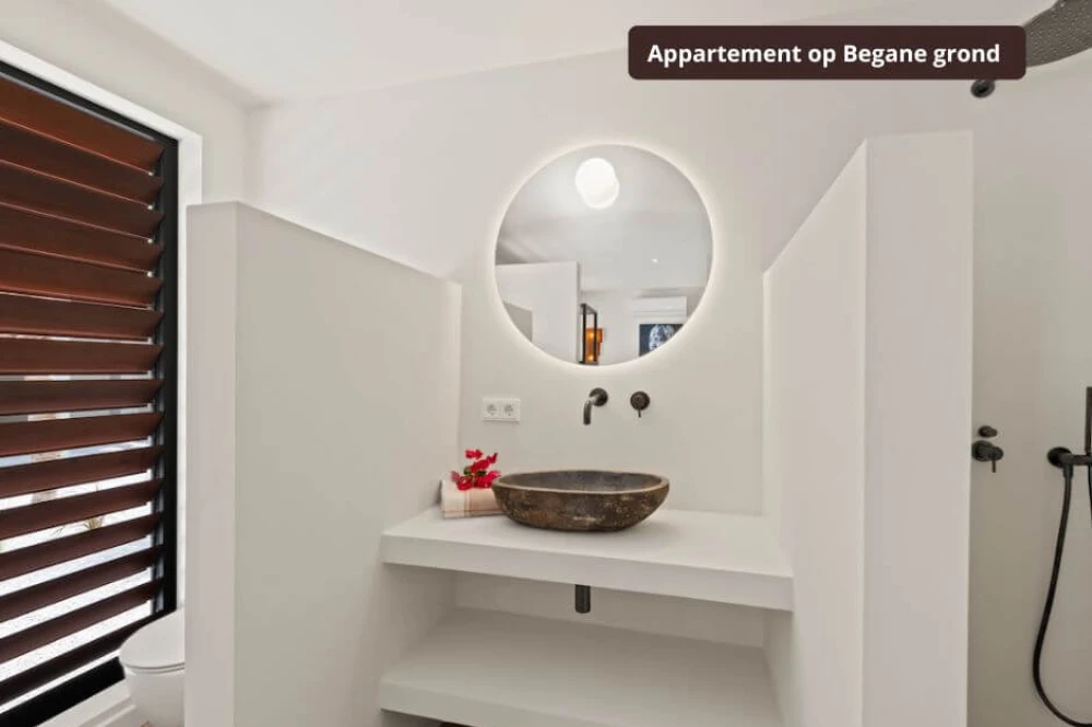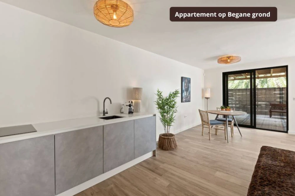 De Appartementen: Luxe op zichzelf Beneden bevinden zich de twee appartementen. Geen donkere kelders, maar lichte ruimtes met eigen ingang, woonkamer, keuken, slaapkamer, badkamer én een eigen schaduwrijk terras. Ook hier heb je een eigen parkeerplaats.